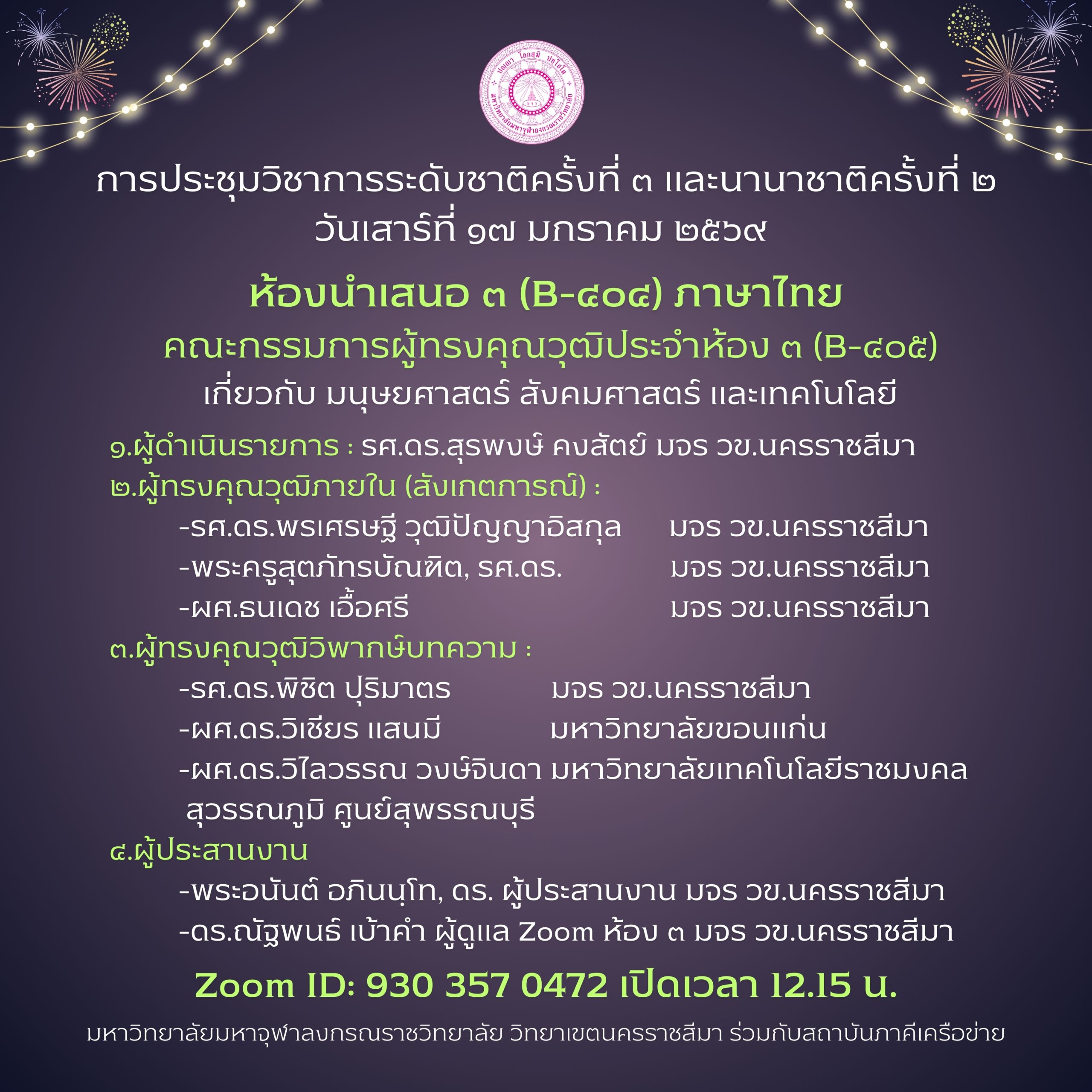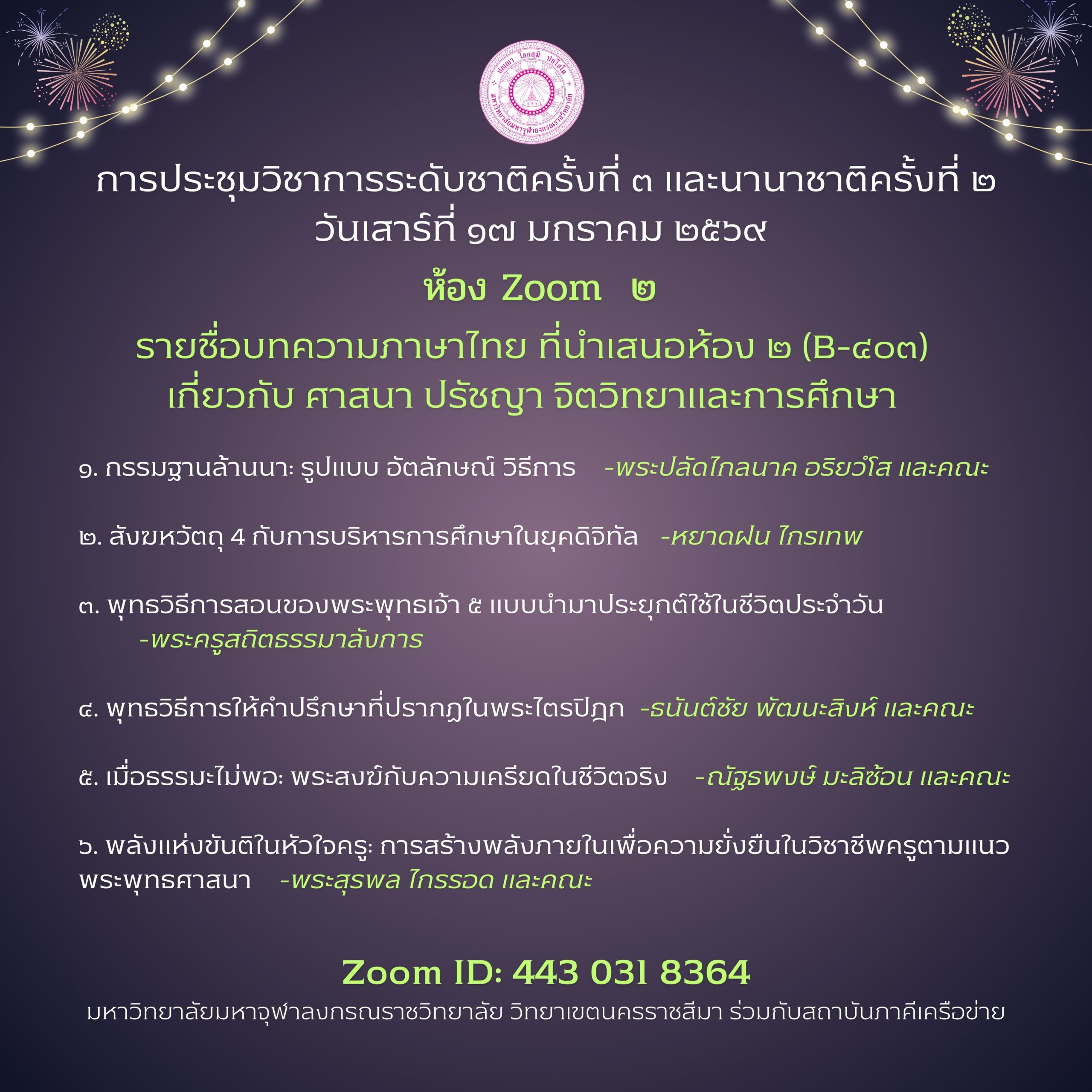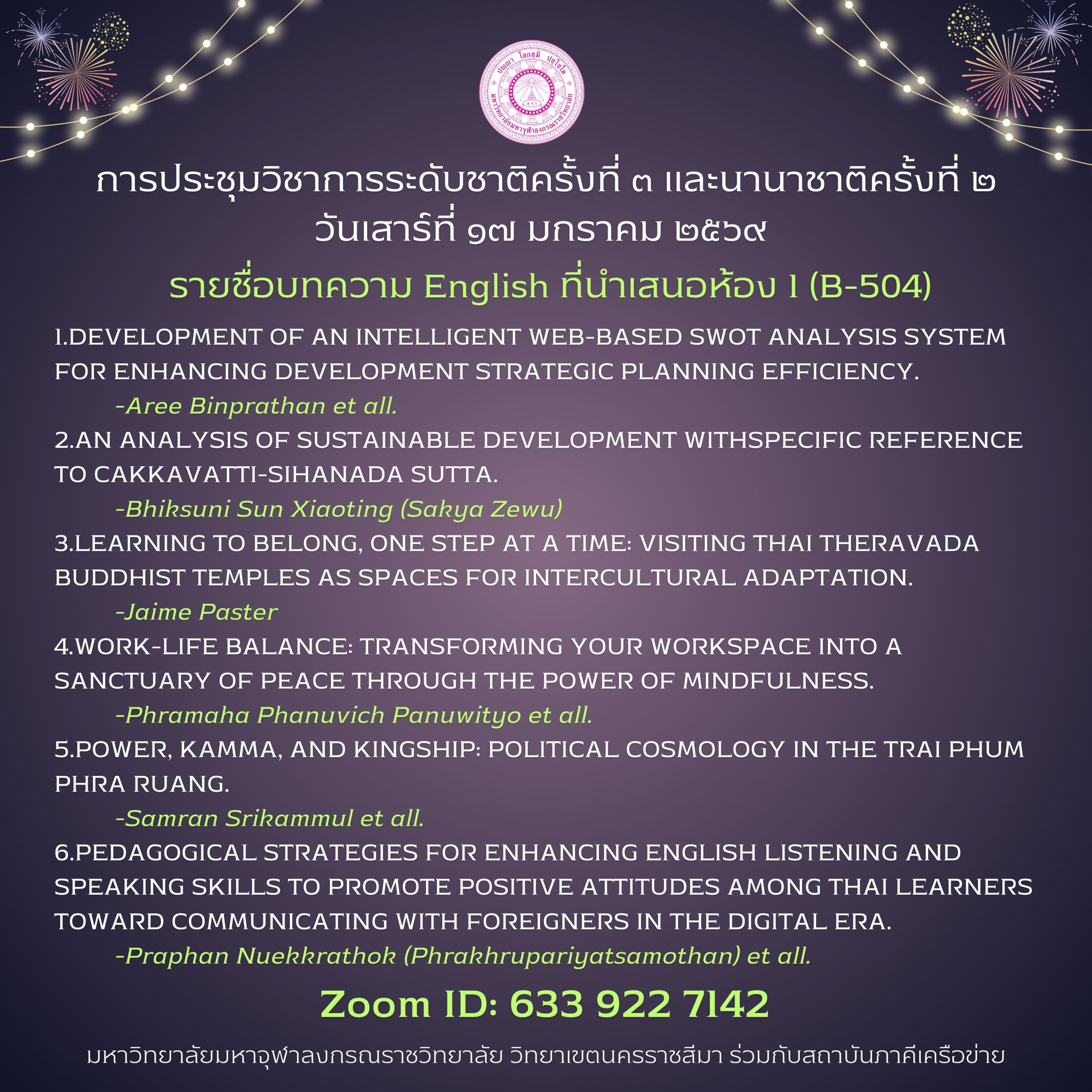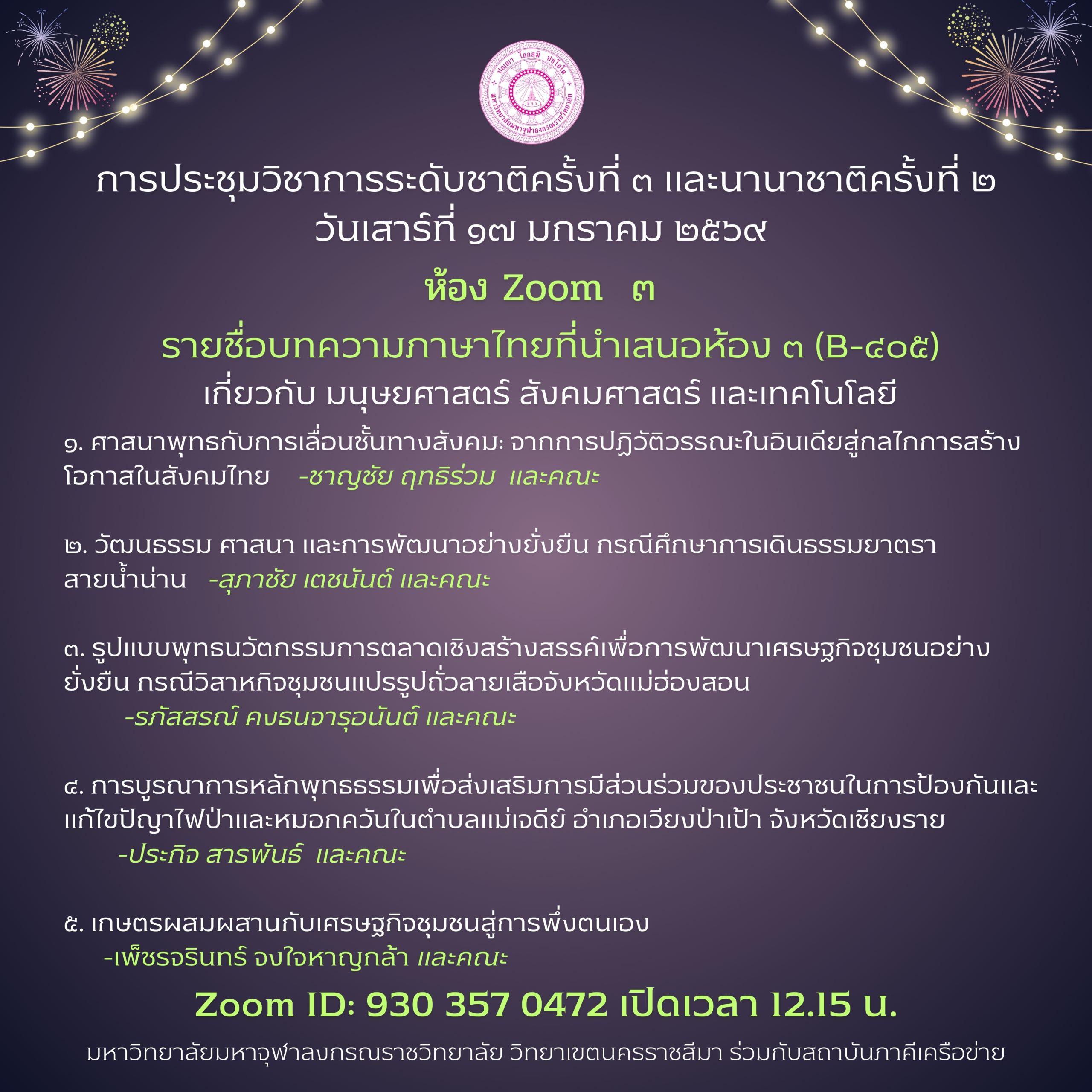 รายชื่อบทความที่ผ่านการวิพากษ์ในห้องประชุมวิชาการ โครงการการประชุมวิชาการระดับชาติครั้งที่ ๓ และนานาชาติครั้งที่ ๒ เมื่อ วันเสาร์ที่ ๑๗ มกราคม พ.ศ. ๒๕๖๙