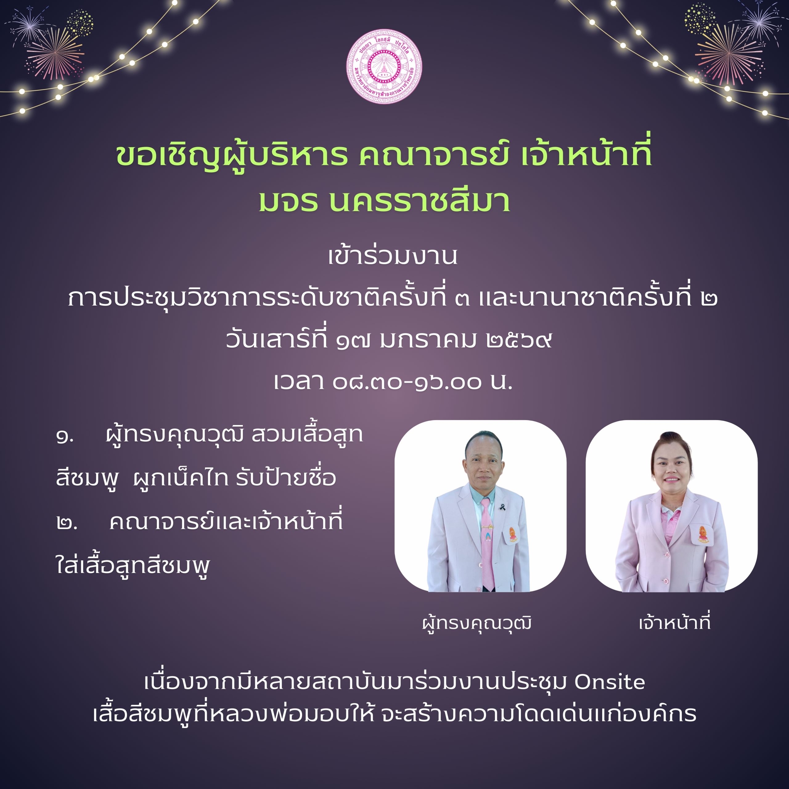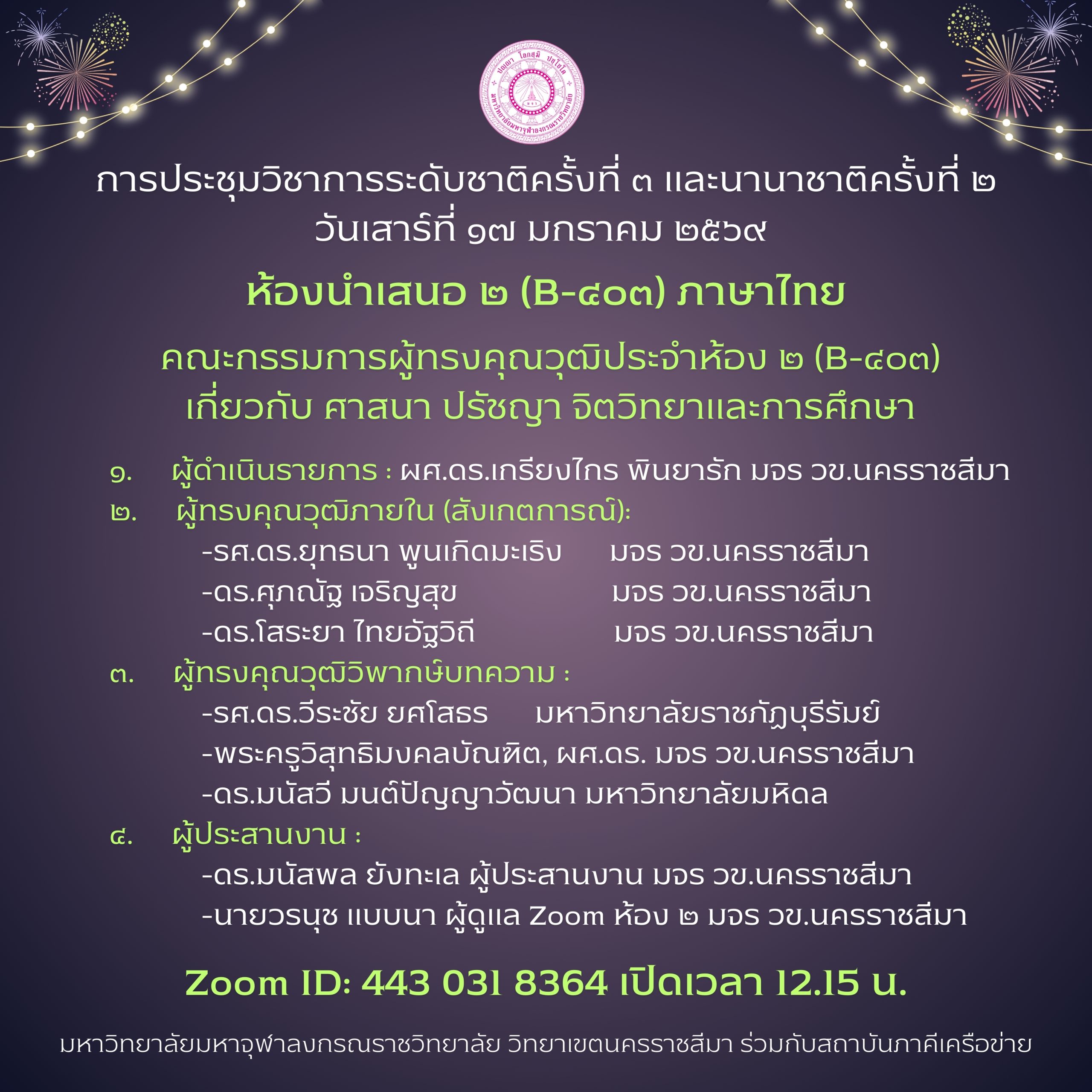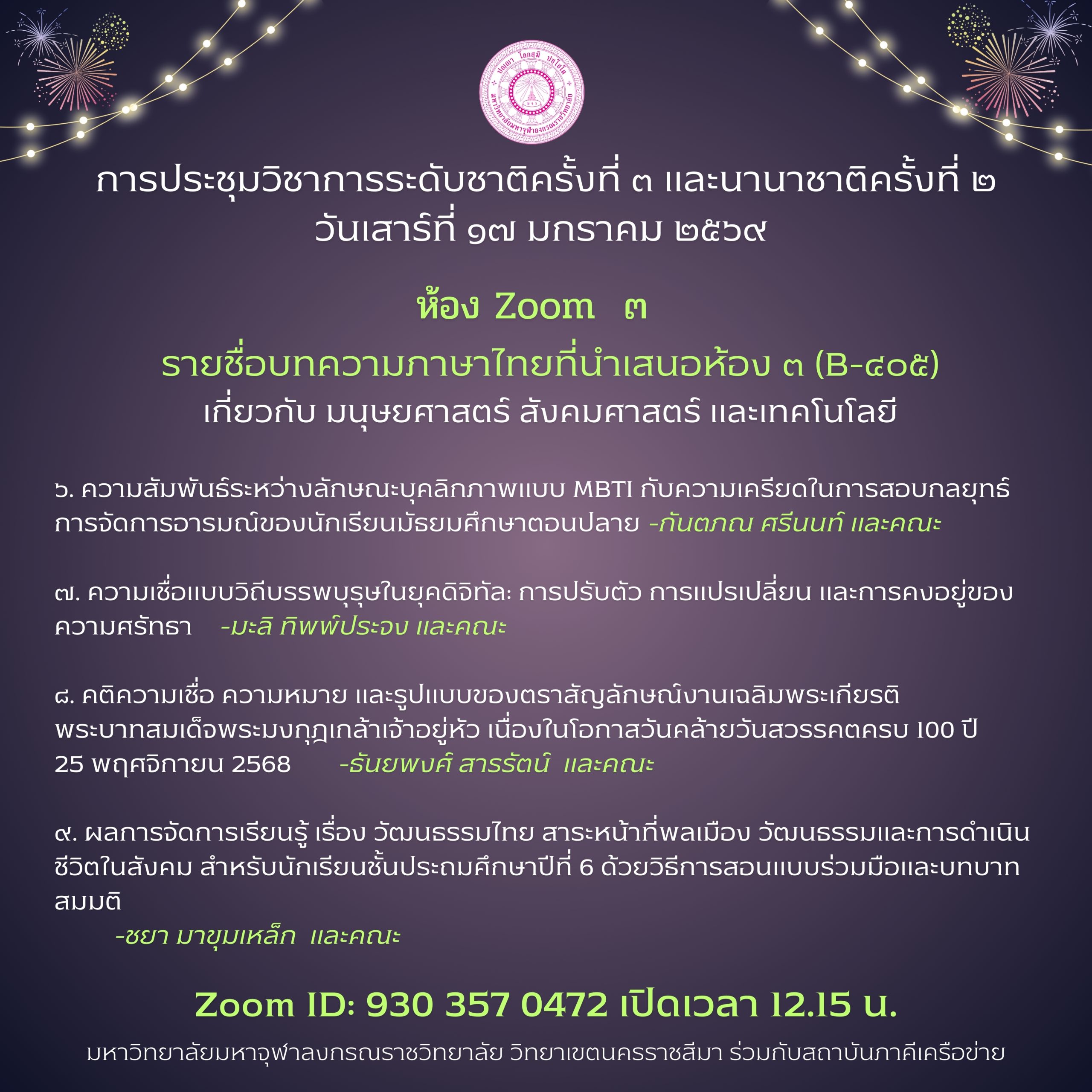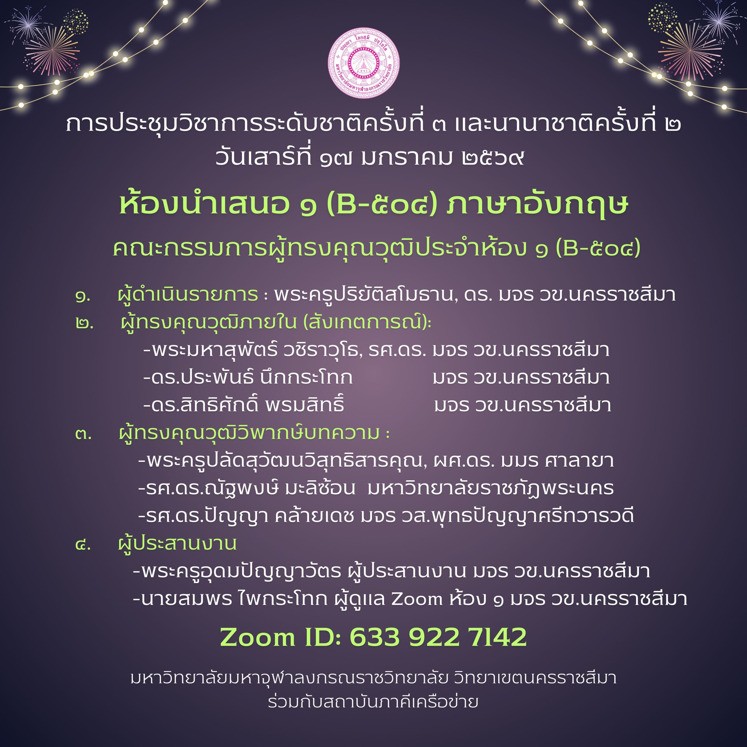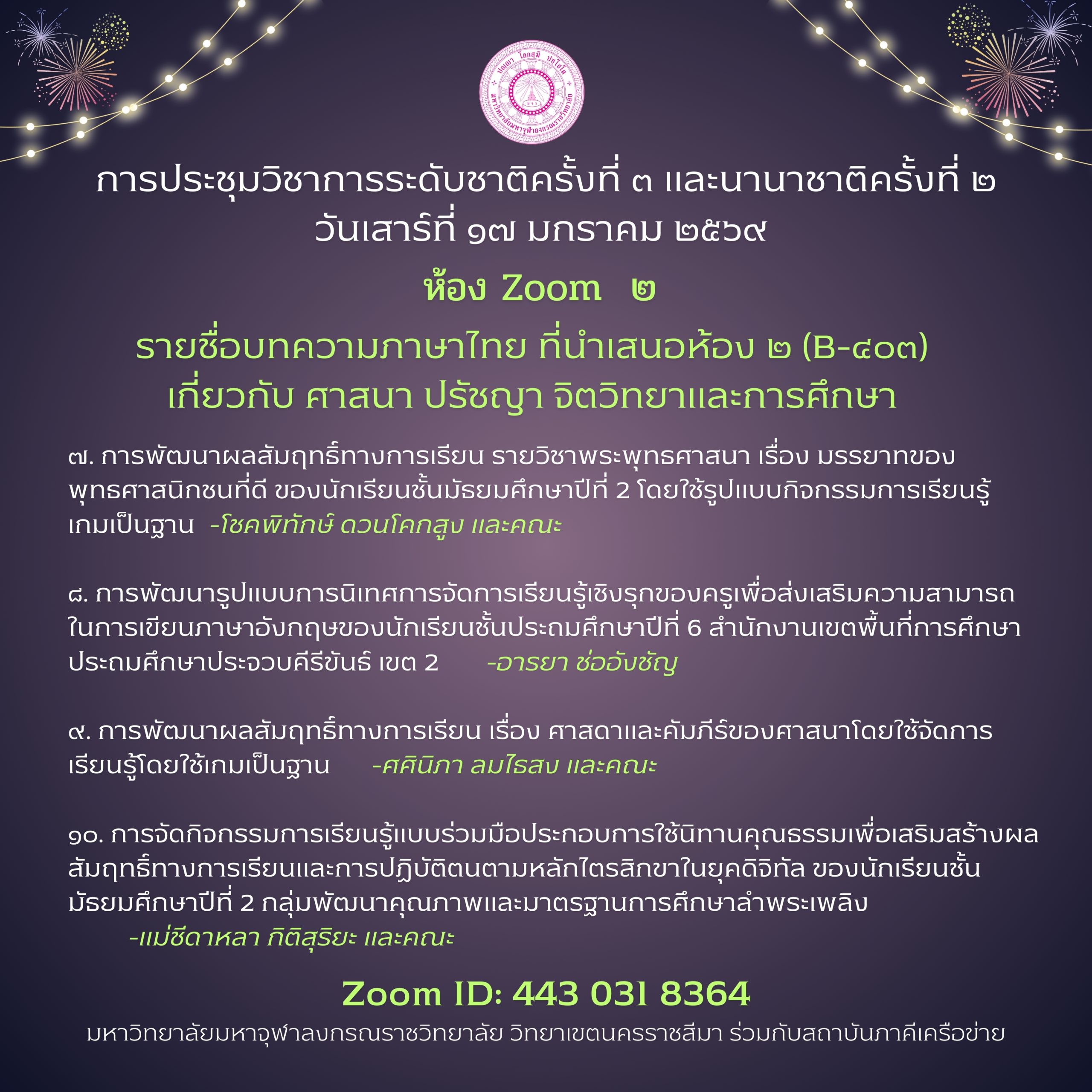 รายชื่อบทความที่ผ่านการวิพากษ์ในห้องประชุมวิชาการ โครงการการประชุมวิชาการระดับชาติครั้งที่ ๓ และนานาชาติครั้งที่ ๒ เมื่อ วันเสาร์ที่ ๑๗ มกราคม พ.ศ. ๒๕๖๙