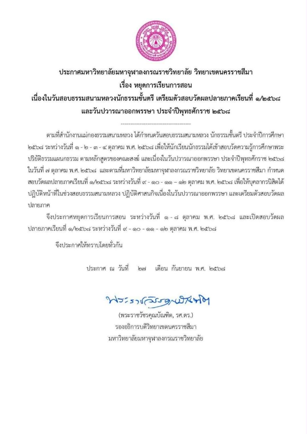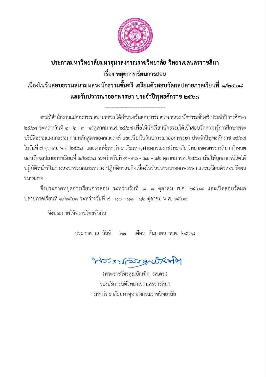 ประกาศมหาวิทยาลัยมหาจุฬาลงกรณราชวิทยาลัย วิทยาเขตนครราชสีมา เรื่อง หยุดการเรียนการสอน