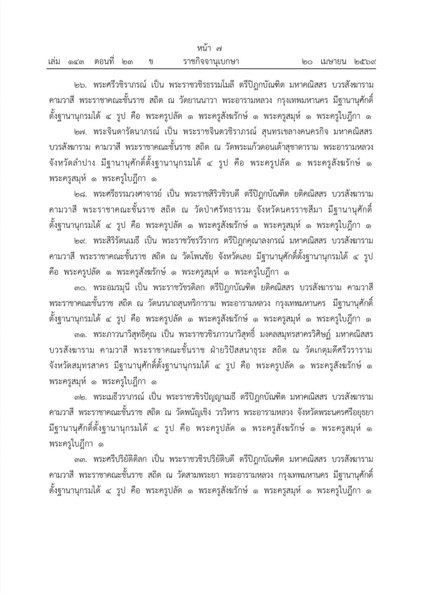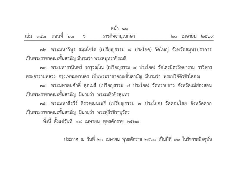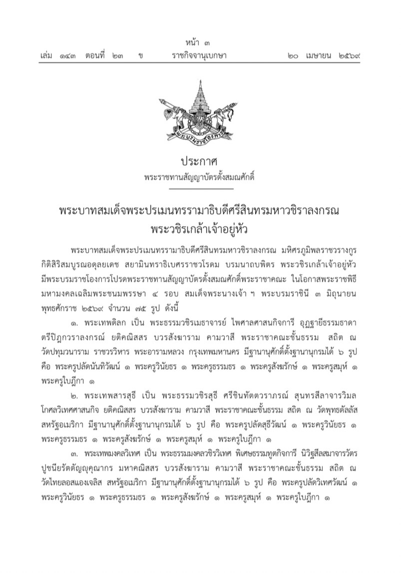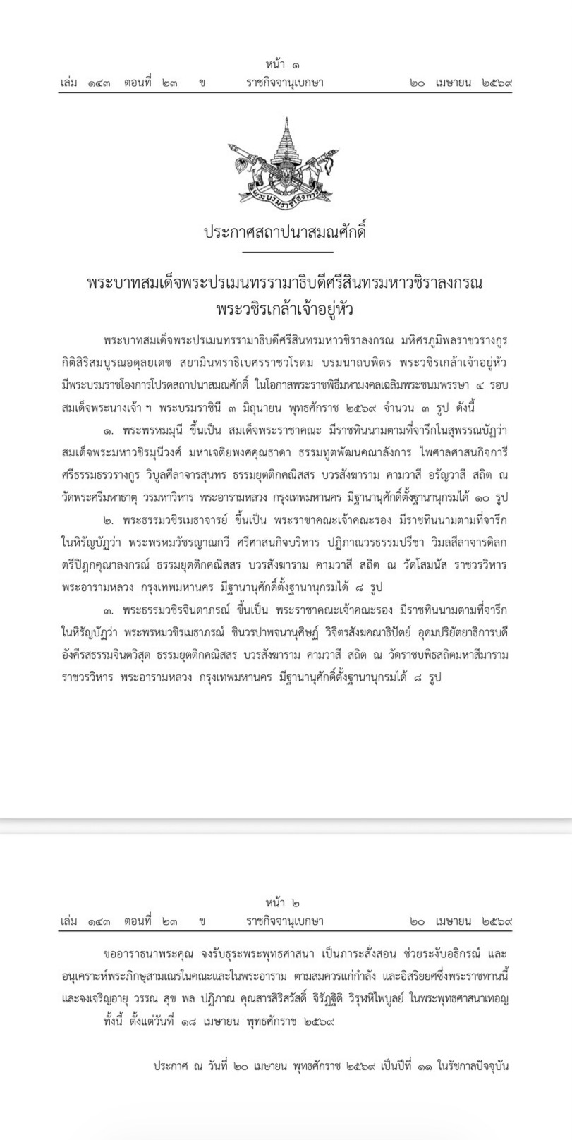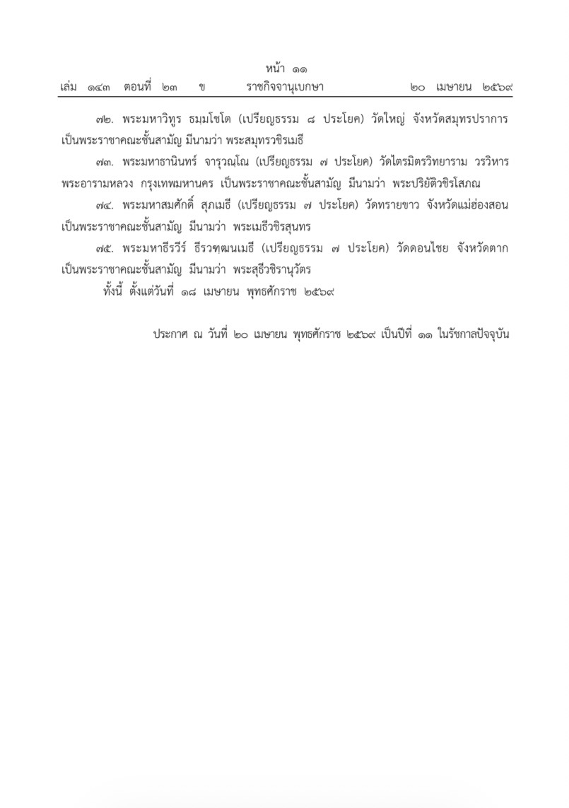 มีพระบรมราชโองการโปรดพระราชทานสัญญาบัตรตั้งสมณศักดิ์พระราชาคณะ ในโอกาสพระราชพิธีมหามงคลเฉลิมพระชนมพรรษา ๔ รอบ