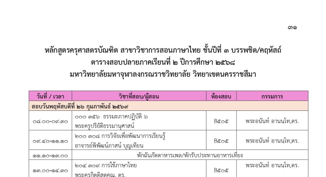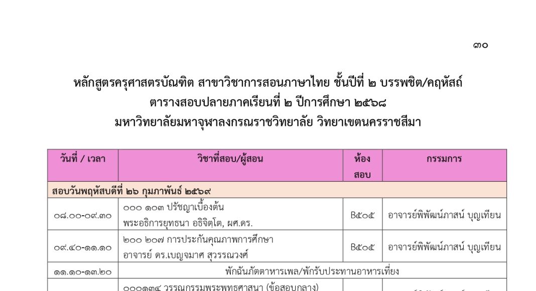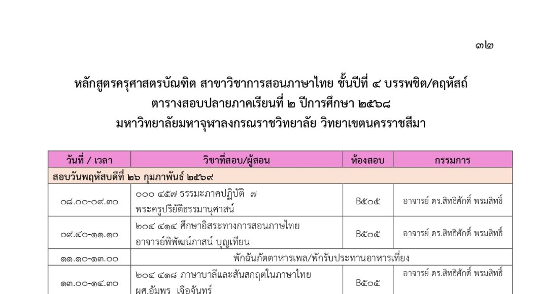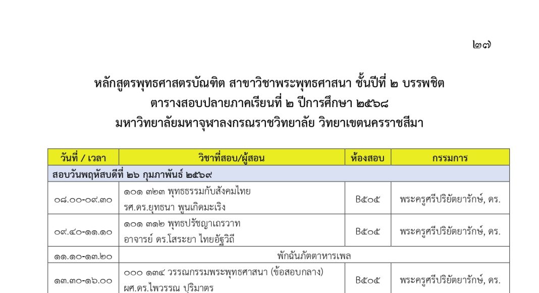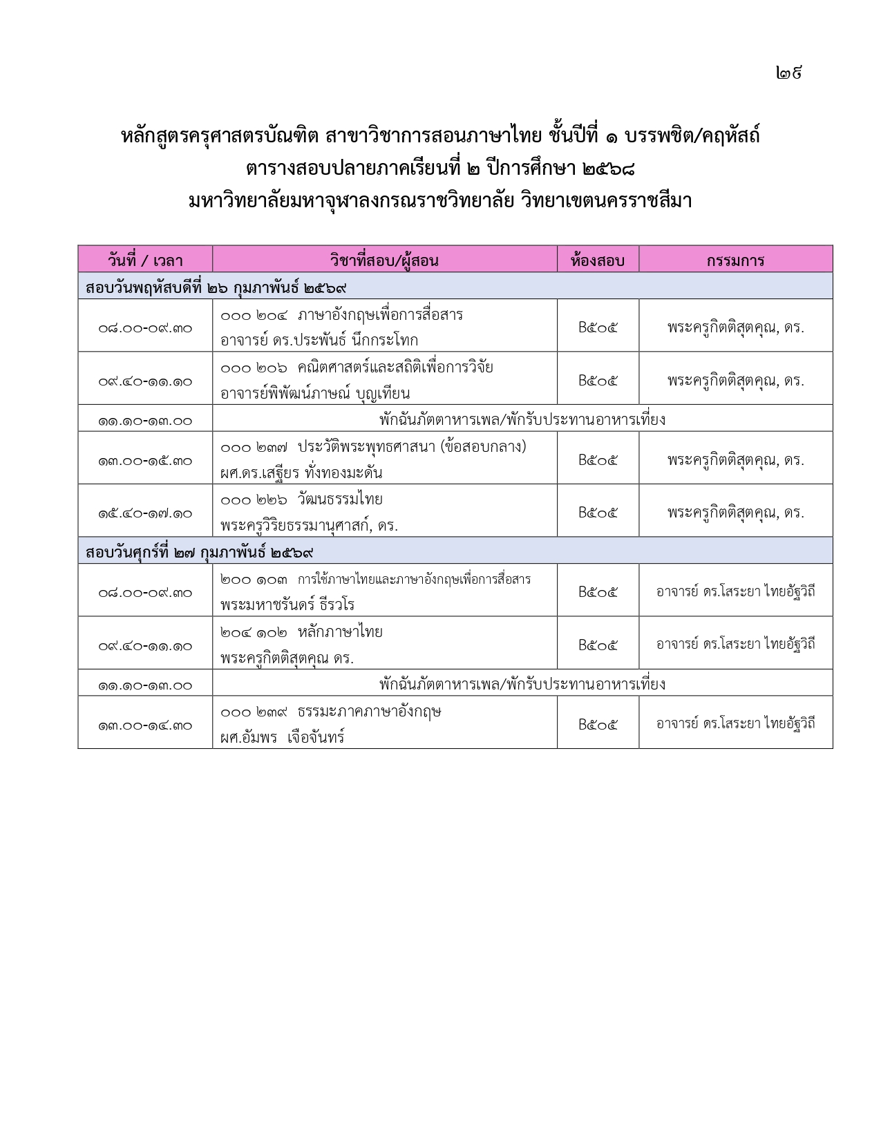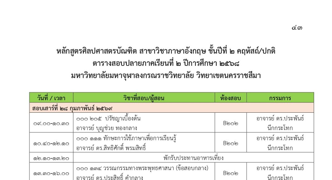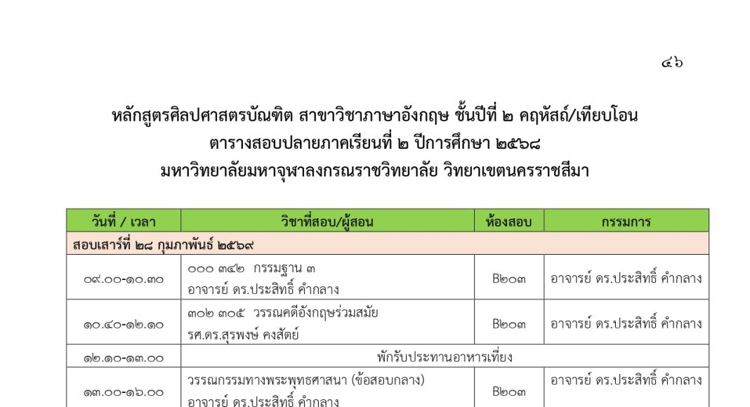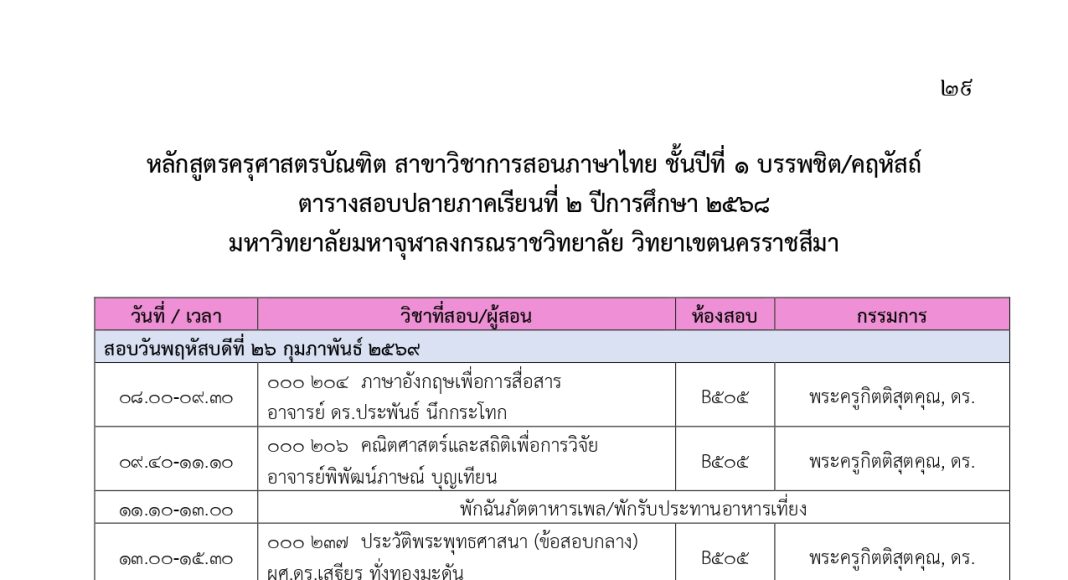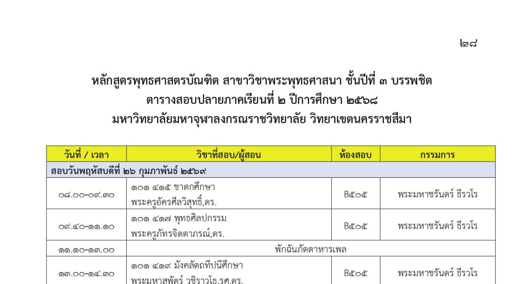 ตารางสอบปลายภาคเรียนที่ ๒ ปีการศึกษา ๒๕๖๘