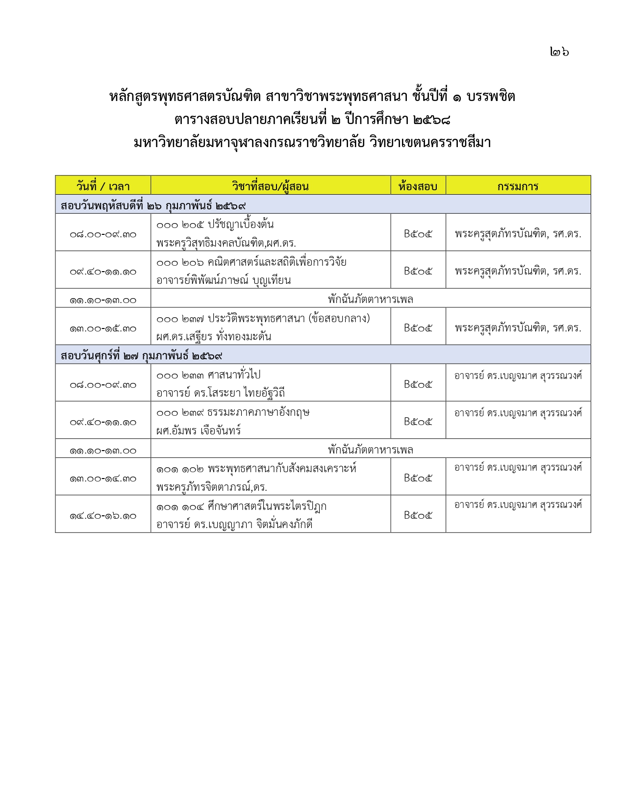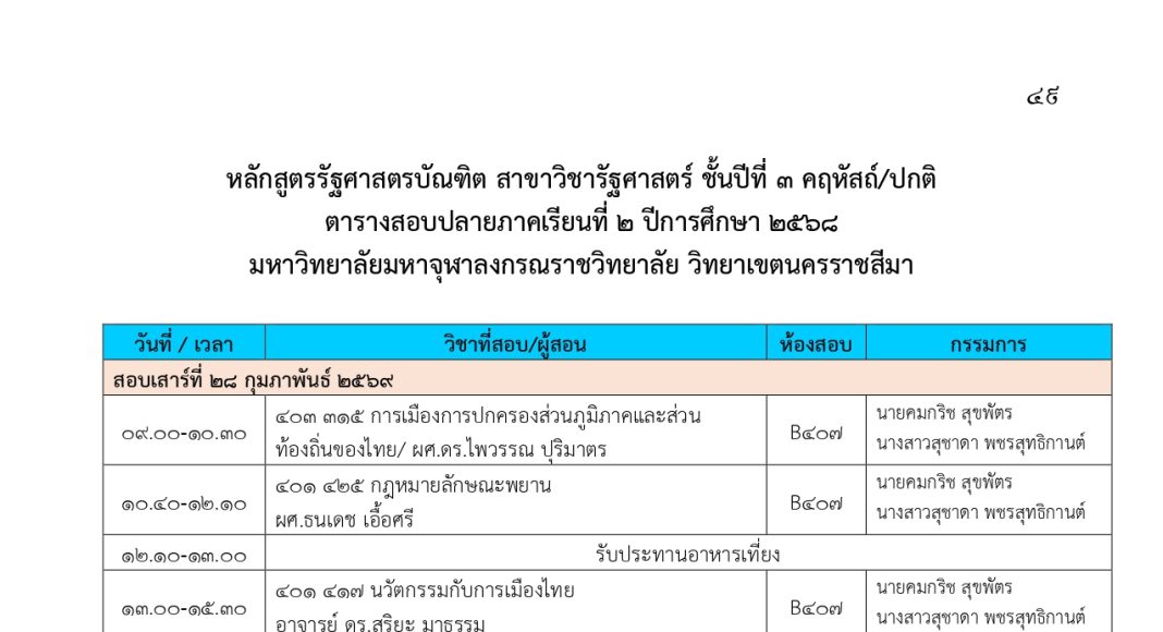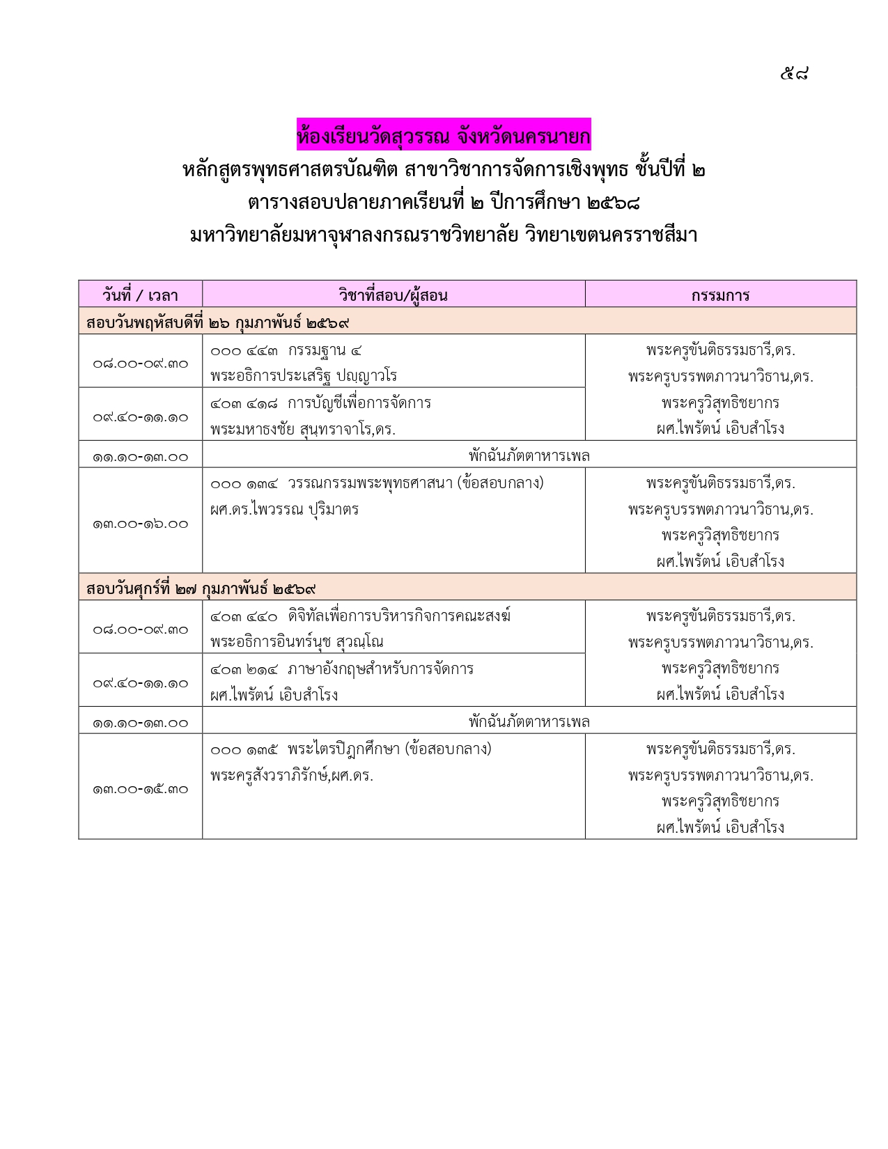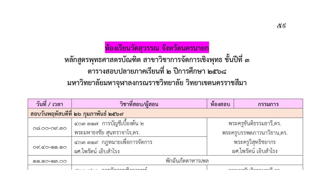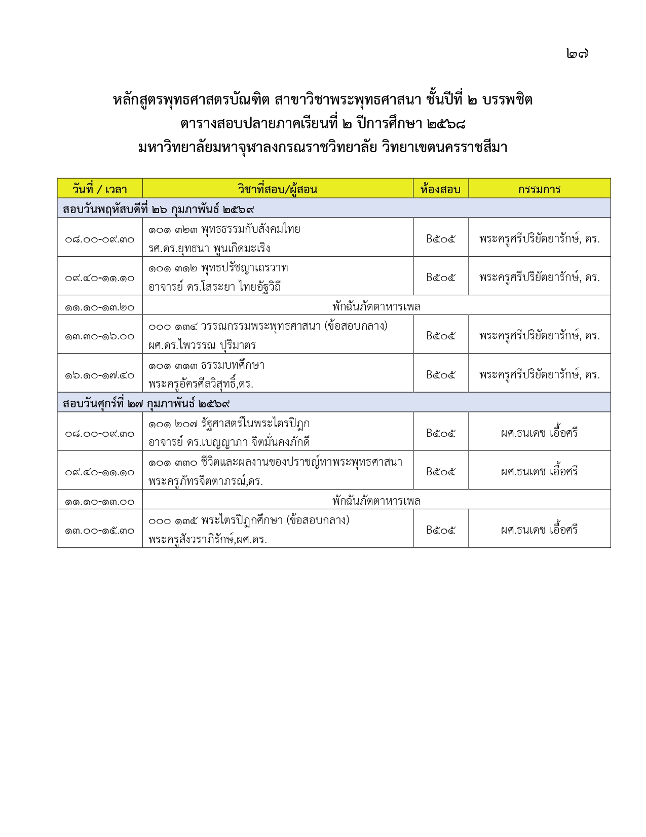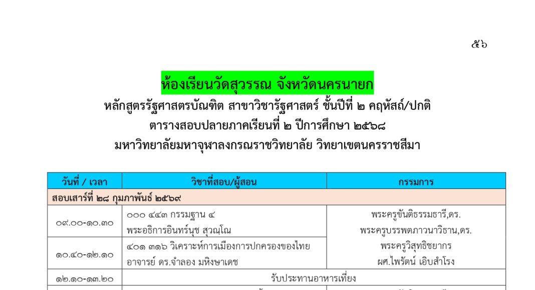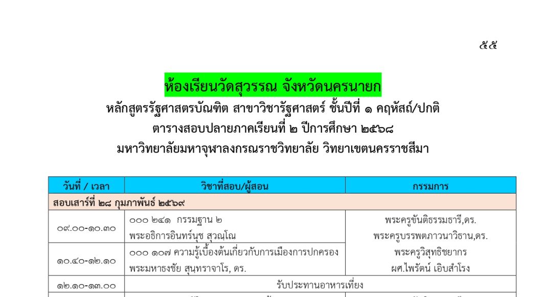 ตารางสอบปลายภาคเรียนที่ ๒ ปีการศึกษา ๒๕๖๘