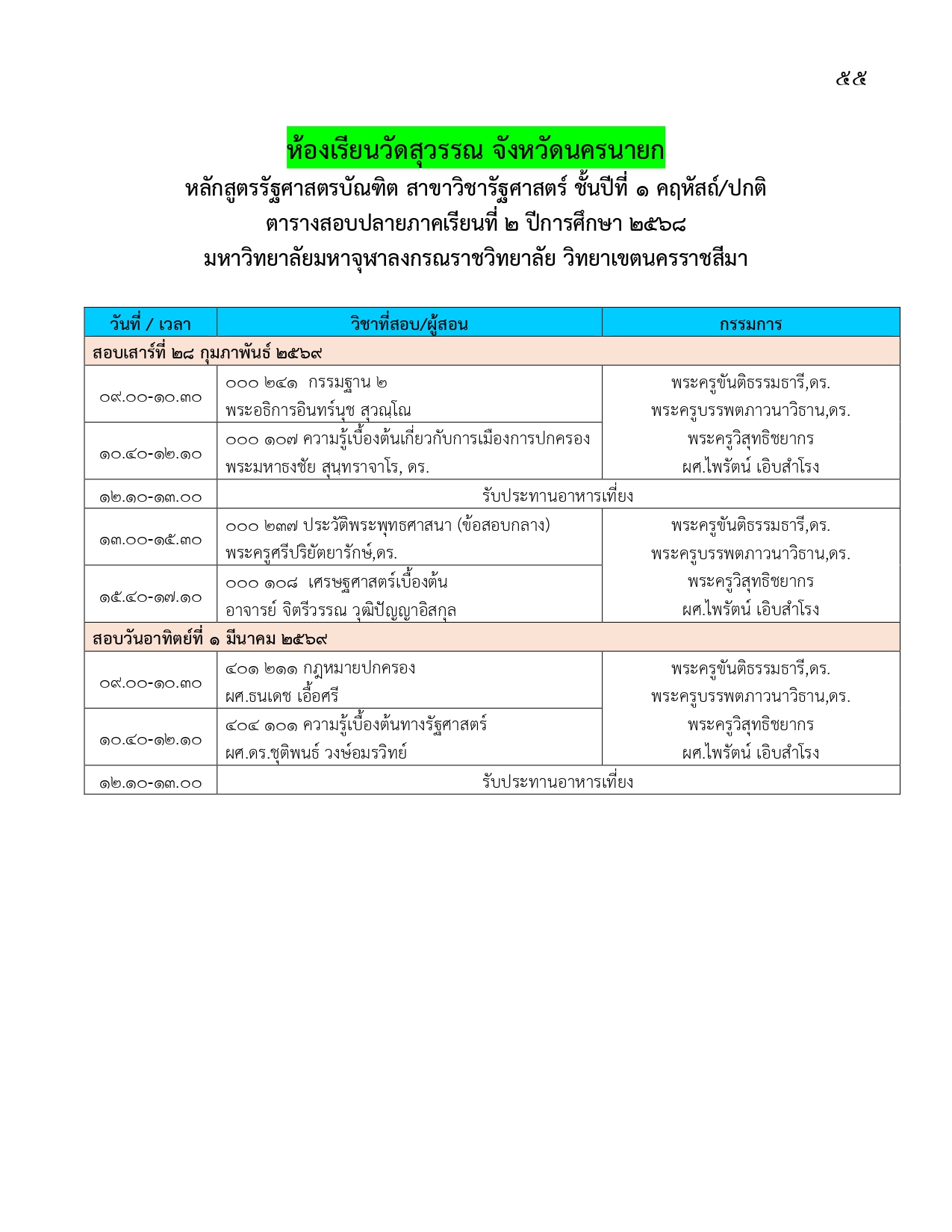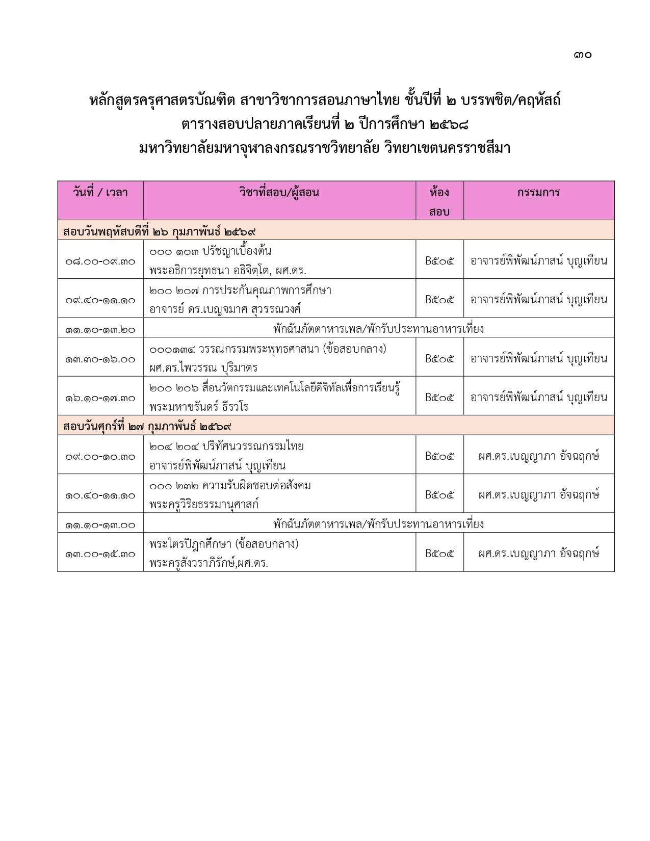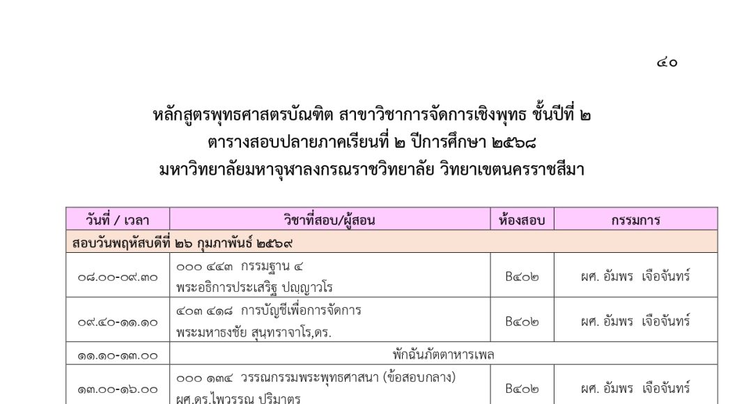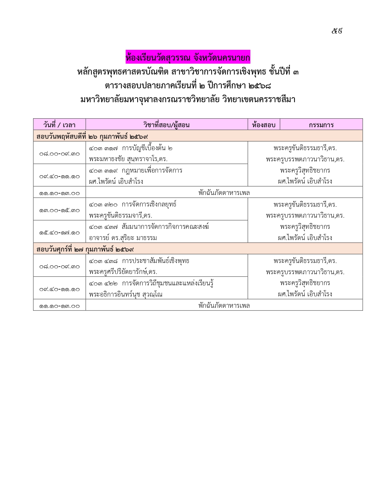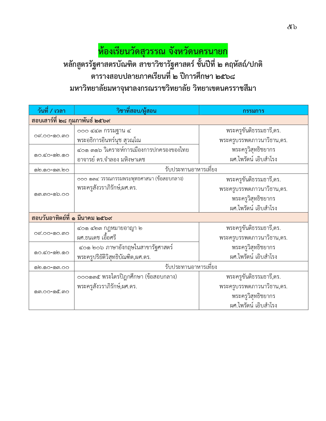 ตารางสอบปลายภาคเรียนที่ ๒ ปีการศึกษา ๒๕๖๘