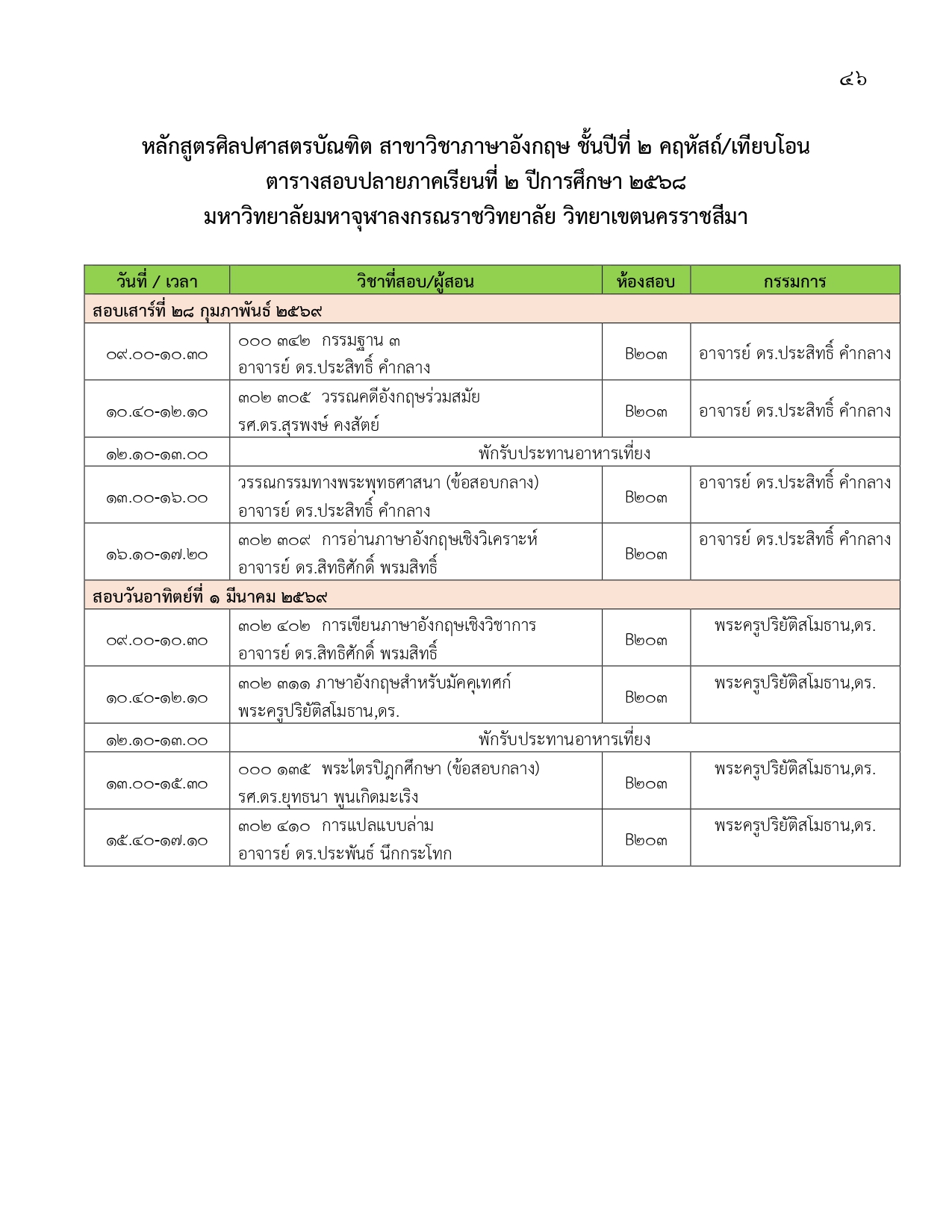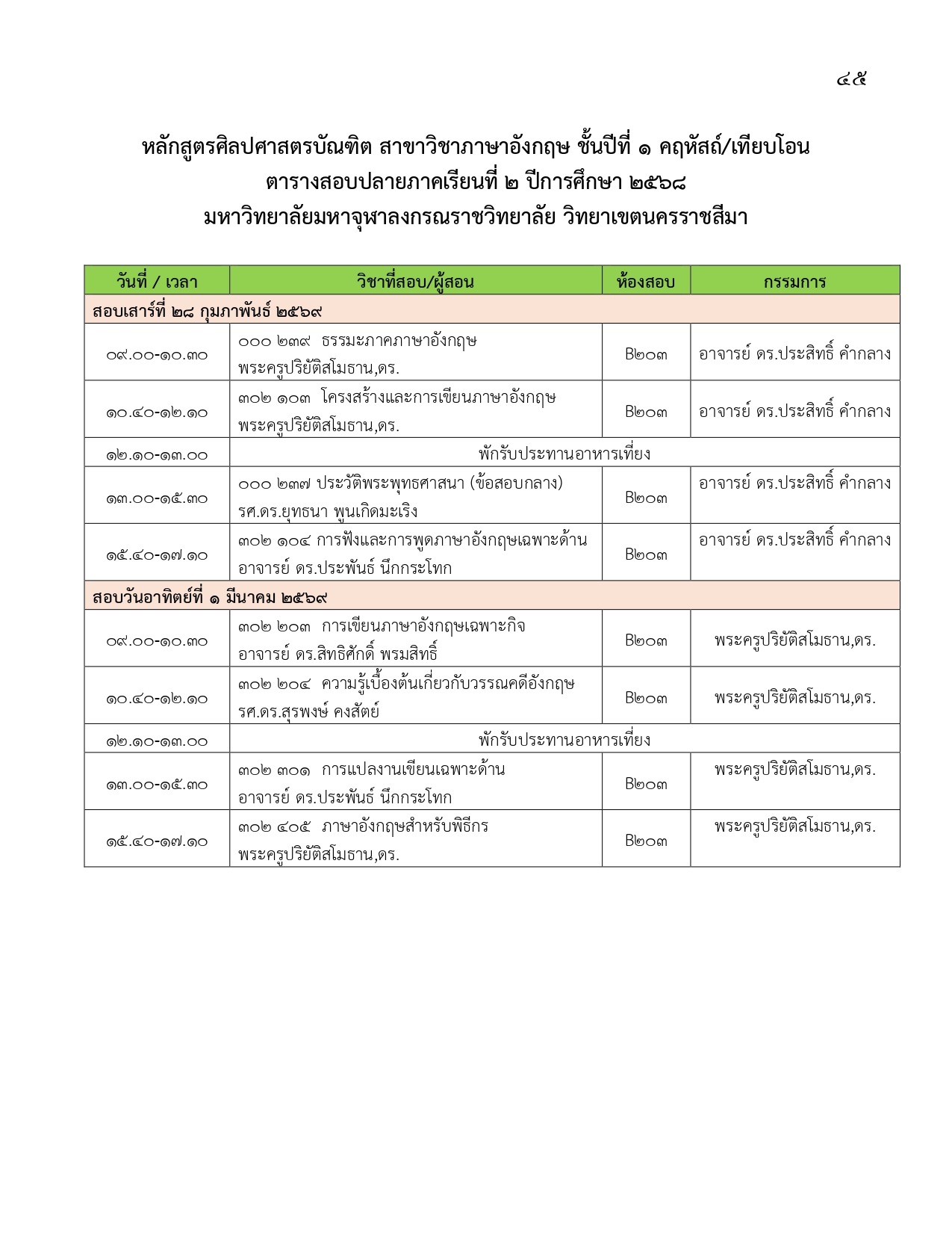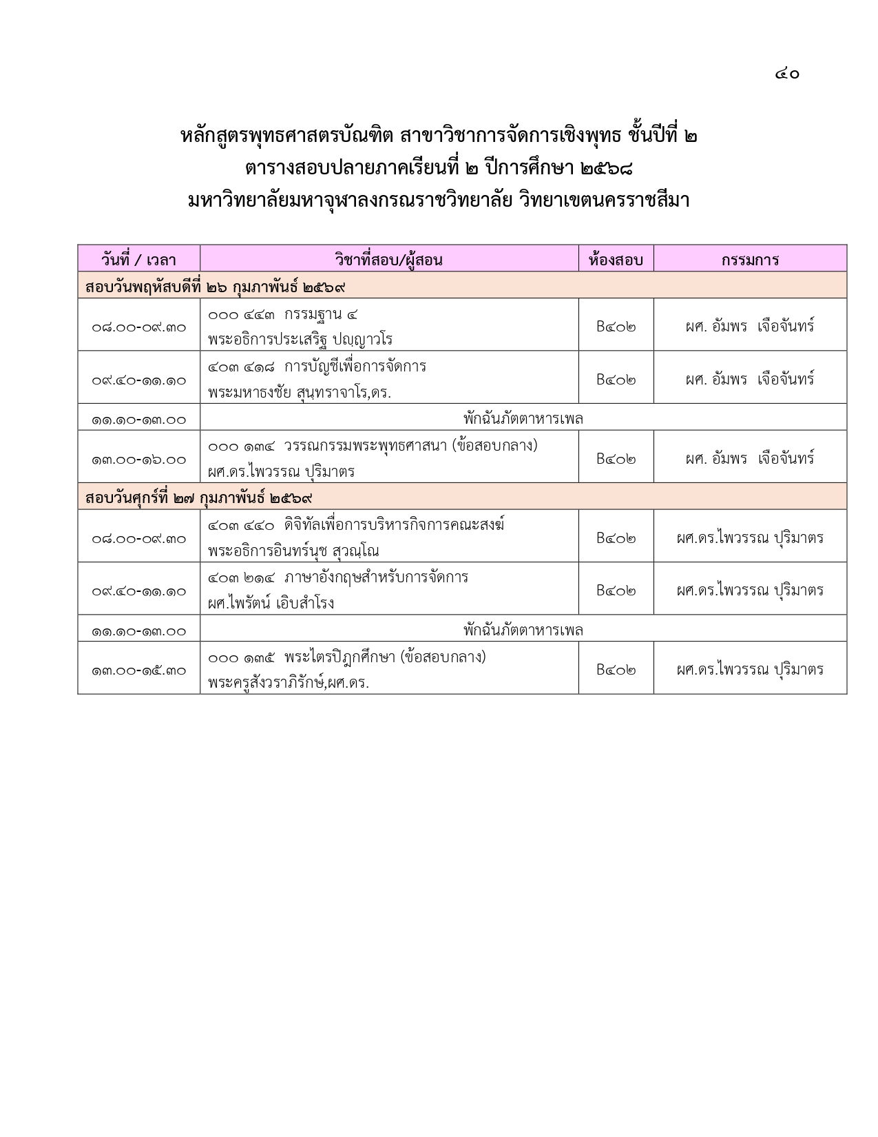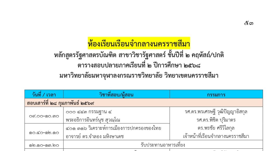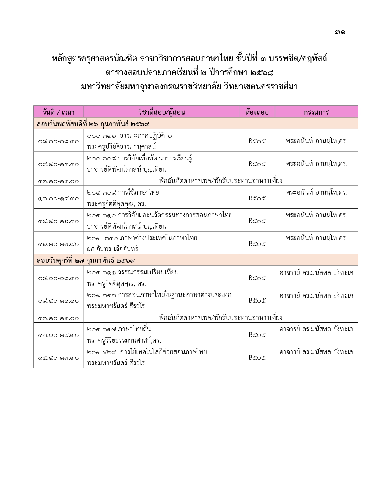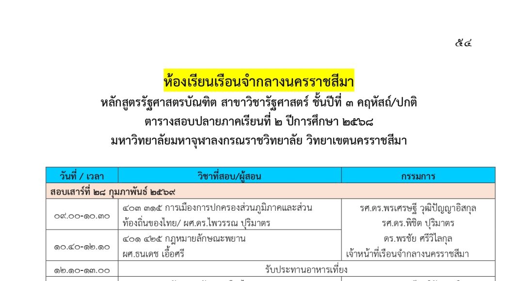 ตารางสอบปลายภาคเรียนที่ ๒ ปีการศึกษา ๒๕๖๘