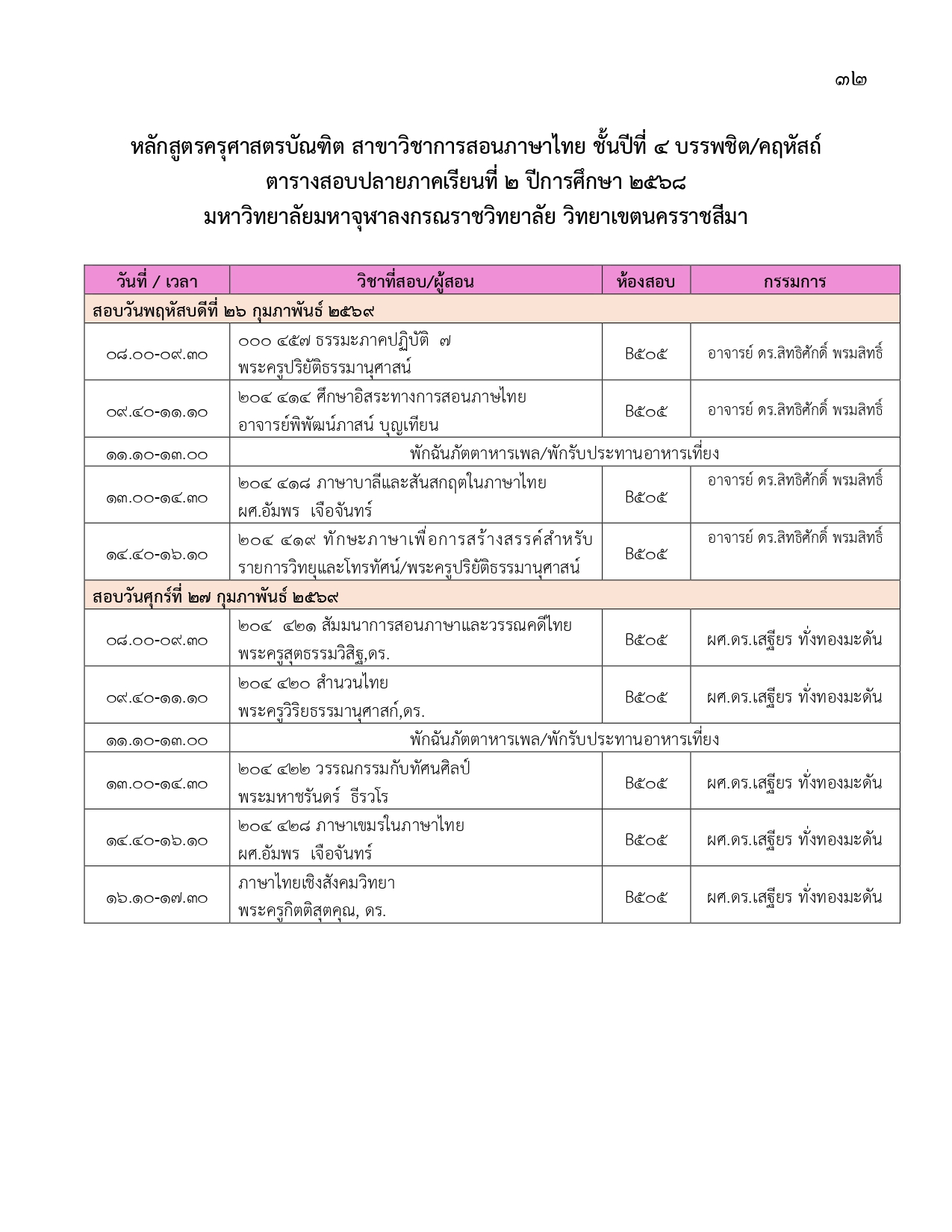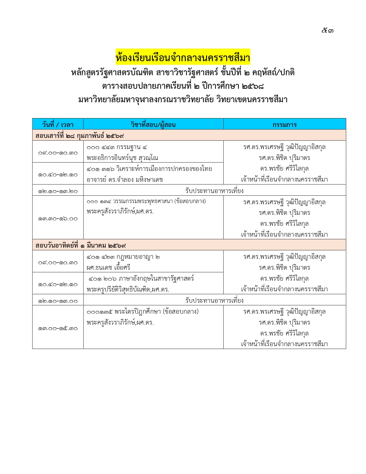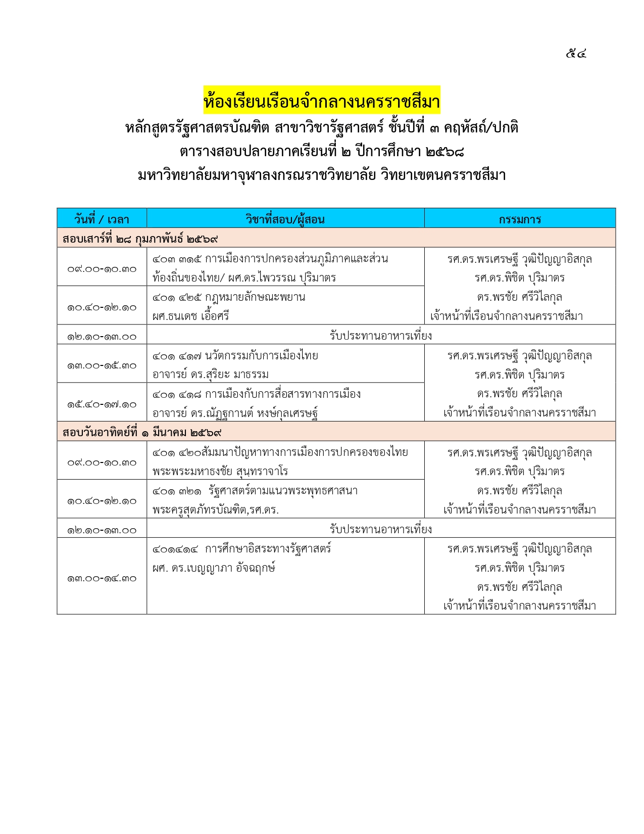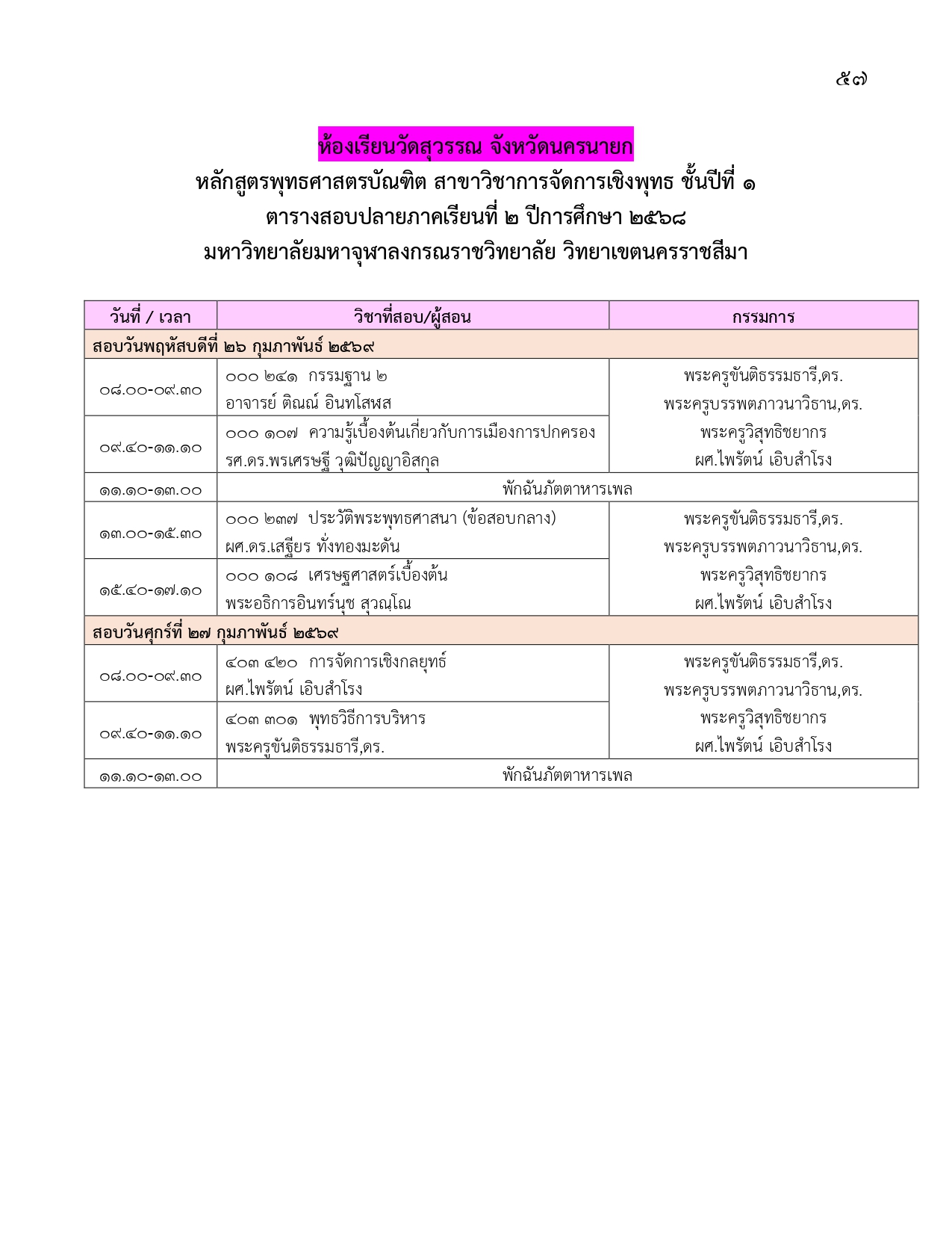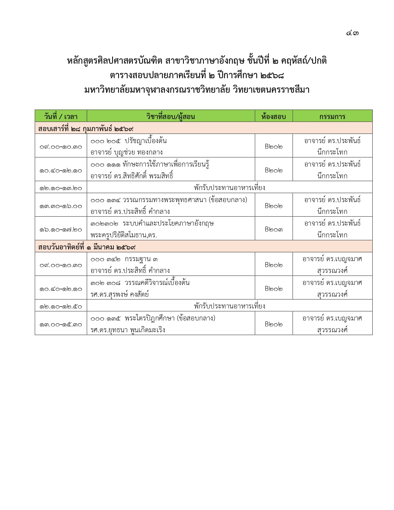ตารางสอบปลายภาคเรียนที่ ๒ ปีการศึกษา ๒๕๖๘